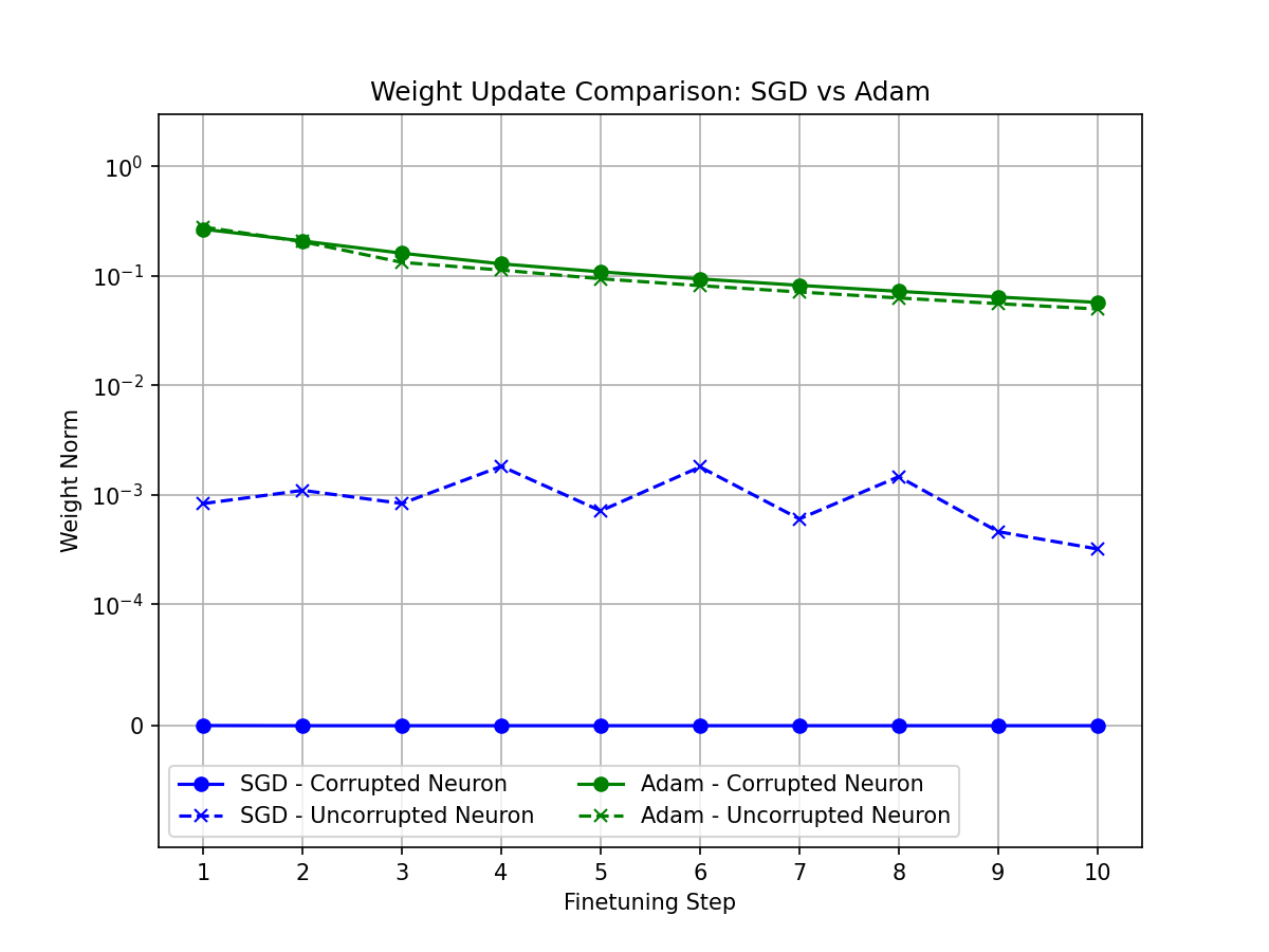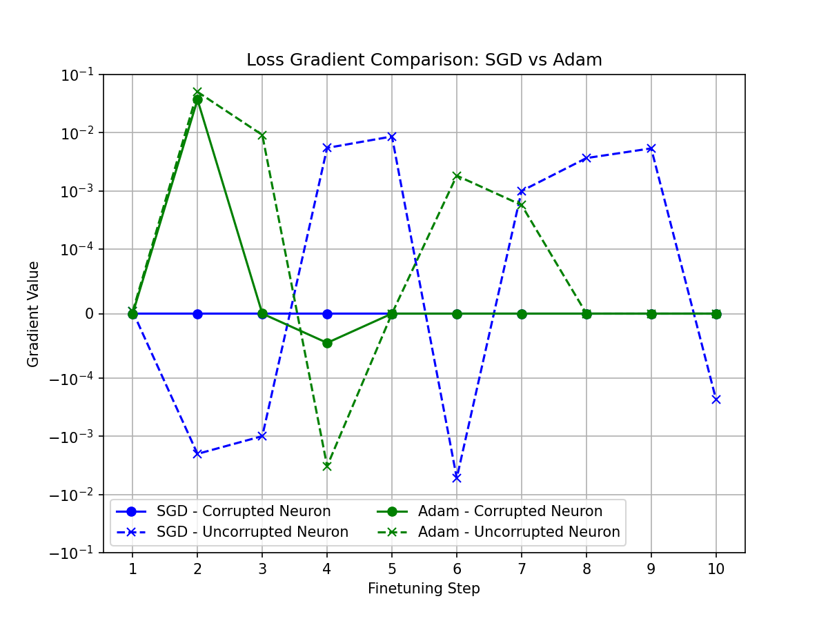 Figure 2(b) shows that corrupted neurons experience highly dampened gradients compared to uncorrupted neurons. Although not visible on the plot owing to scaling, the corrupted neuron under SGD sees a loss gradient only in the first step (\(e^-7\)) and is \(0\) thereafter. Under Adam optimisation, the gradient varies much more until step 5 and then also remains \(0\). Maintaining a loss gradient of 0 is essential to ensure data is trapped once and then remains without addition until the end of finetuning.